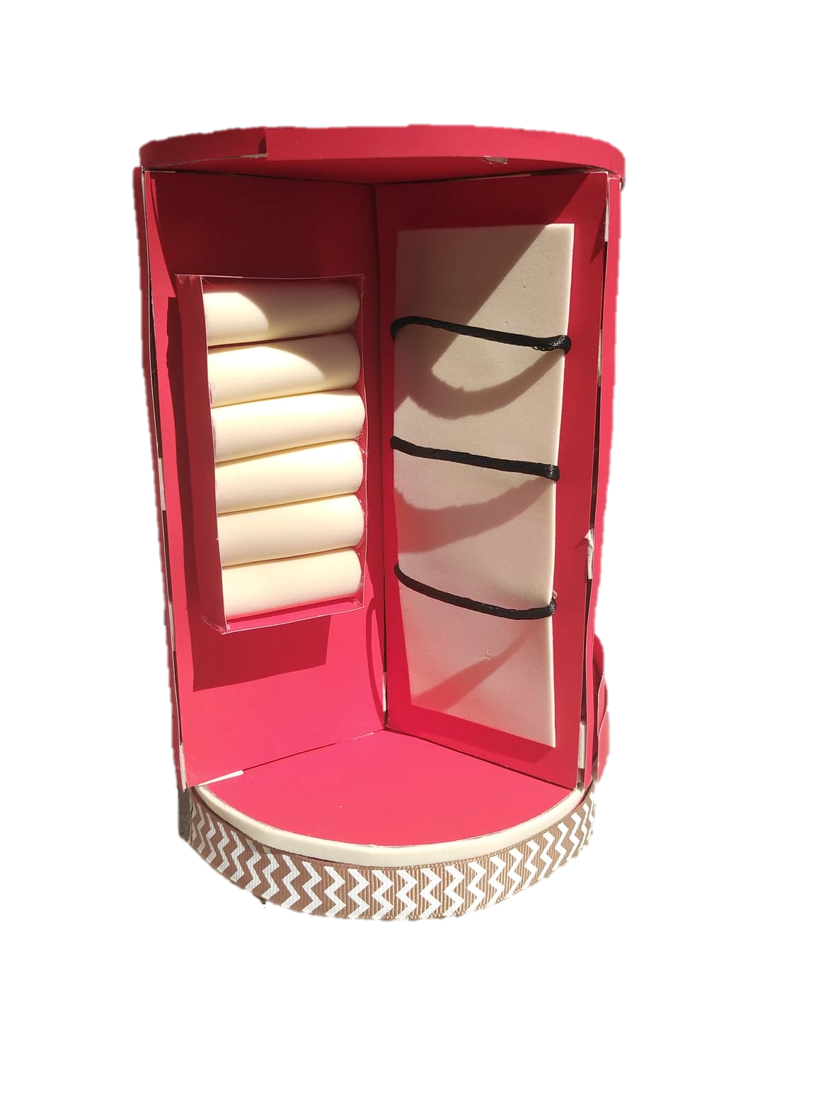 Organizador circular giratorio es un un producto que ayuda en la organización del espacio personal cuenta con 3 secciones de las cuales la primera es un pequeño gabinete que cuenta con 3 repisas, el siguiente es un soporte ya sea para colgar en ganchos o sujetar con clips algunos accesorios por ultimo un soporte con un exhibidor de anillos y uno para aretes. Es un articulo que no ocupa mucho espacio y es manejable debido a su tamaño
